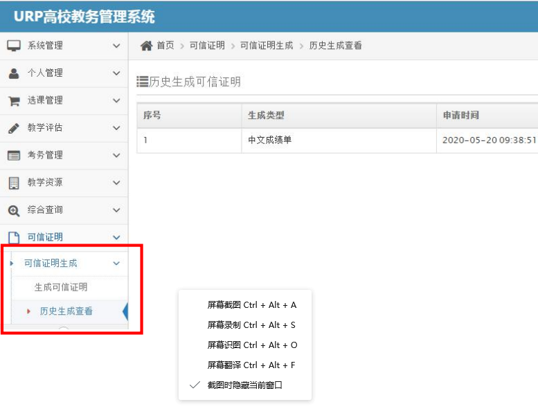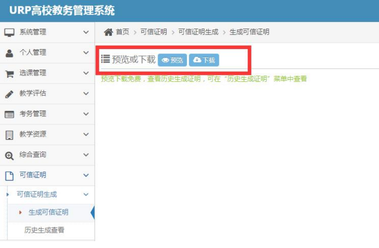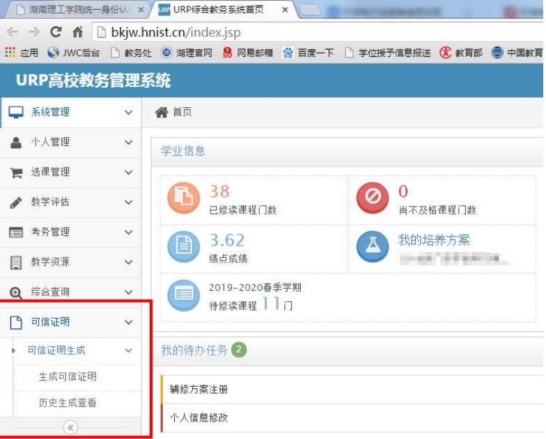 员工申请可信证明的操作流程 1 )通过 https://www.hnist.cn/ 太阳集团tyc539macau官网进入信息门户(右上角)。 2 )输入学号和密码登录。 3 )点击【员工教务管理系统】。 4 )点击【可信证明】→【可信证明生成】→【生成可信证明】 5 )在【生成可信证明】页面按需求选择证明类型,然后点击【生成并签章】。 6 )可信证明生成后,可选择【预览】进行浏览或点击【下载】保存。 7 )员工通过【历史生成查看】可看到自己所有的可信证明生成记录。