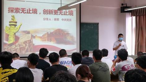 因为热爱,所以奔赴;因为责任,所以坚守。谢君以极富条理的演讲叙述了在科研创新方面的独特感悟和见解,同时间接介绍在老员工活中的科研方面的可行发展。眼里有光,脚底有路;谢君从大一时期的心路历程出发,贴合新生同学们的心理,以工作和学习上的挫折和努力鼓励同学们积极进取,勇往直前。探寻方向,告别迷茫;作为“新手小白”,同学们对大学四年里的创新实践、学科竞赛不甚了解。谢君以此为出发点,简单介绍、分享经验,再现推陈出新的科研与创新精神和责任意识。