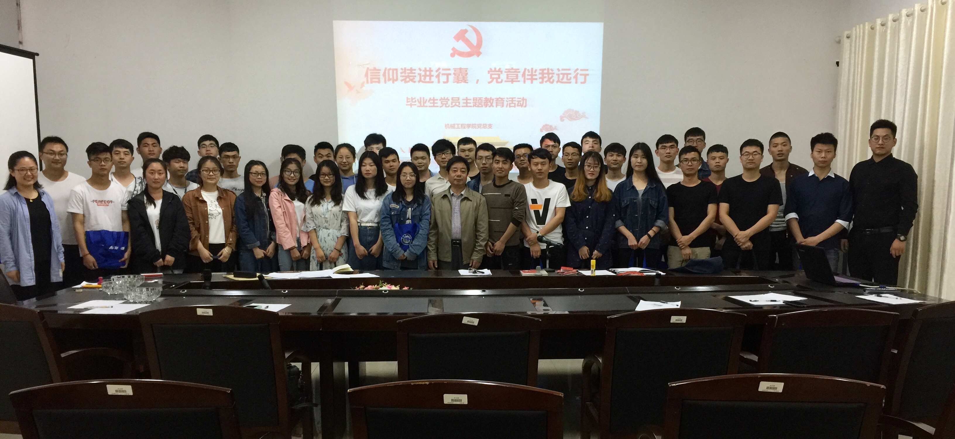 最后,三位老师和部分党员同学现场给大家发放“党章行囊”,本次毕业生党员教育活动在老师对同学们的祝福和希望中落下帷幕,全体与会人员合影留念。