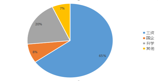 从图2可知,公司2017届毕业生参加就业形式主要分为两大类:第一类是签订就业协议书形式就业,此类占65%;第二类是升学,此类占20%。其他形式,如签订劳动合同、用人单位接收函等形式占15%。公司前两类和其他类别就业形式毕业生达到92%,说明公司毕业生绝大部分在法律规范形式范畴内实现就业。