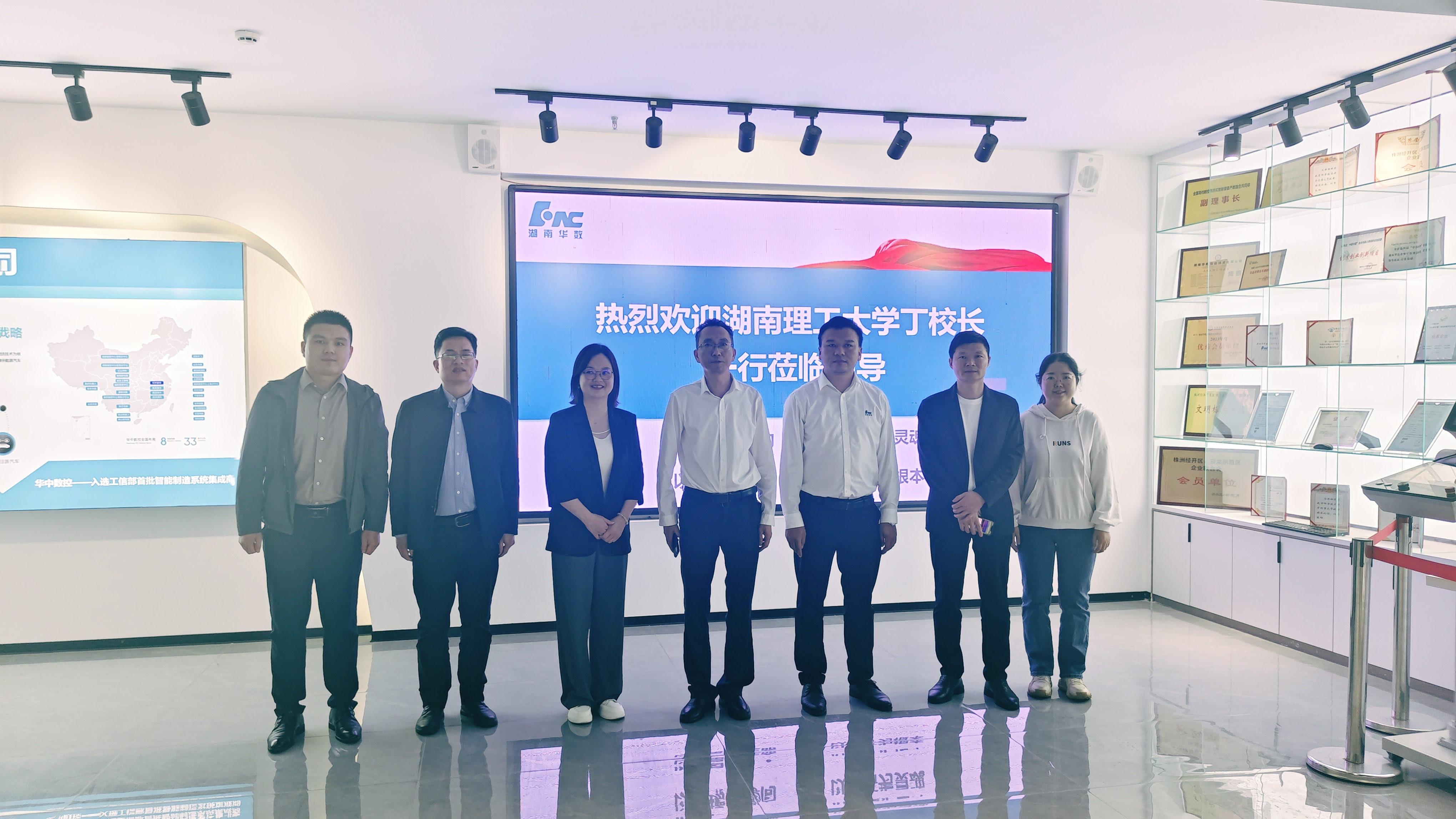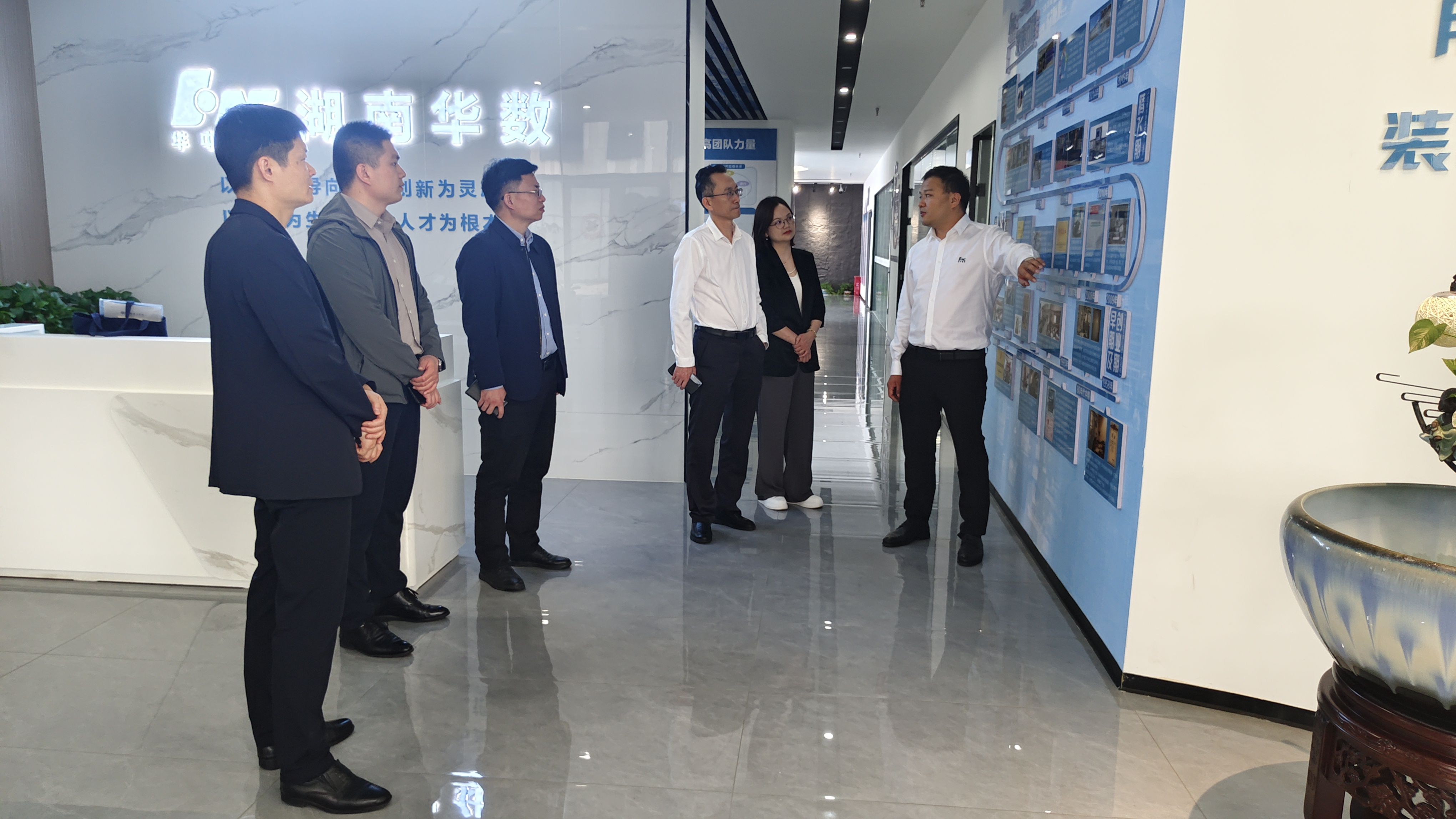 湖南华数智能技术有限公司副总经理邹飞对丁跃浇副董事长一行的到来表示热烈欢迎。陪同参观了公司的研发部门以及产品展示区,详细了解公司在智能机械设备、自动化控制系统等核心业务领域的发展现状、技术优势以及未来规划。