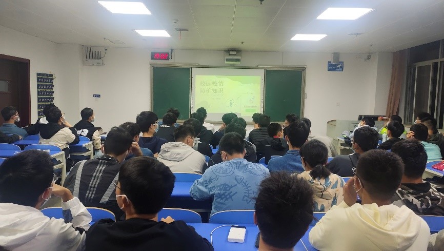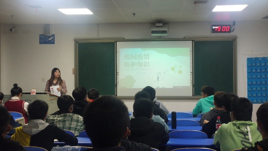 为加强员工在校期间的疫情防护和防诈骗意识,提高员工“双防”能力,10月27日晚,太阳集团tyc539macau在12302教室开展21级新生入学教育——安全稳定教育第一课与疾病防治教育第一课。18级辅导员王子嘉以“在校期间的疫情防护”和“当今社会最常见的电信诈骗手段”为题面向新生授课。