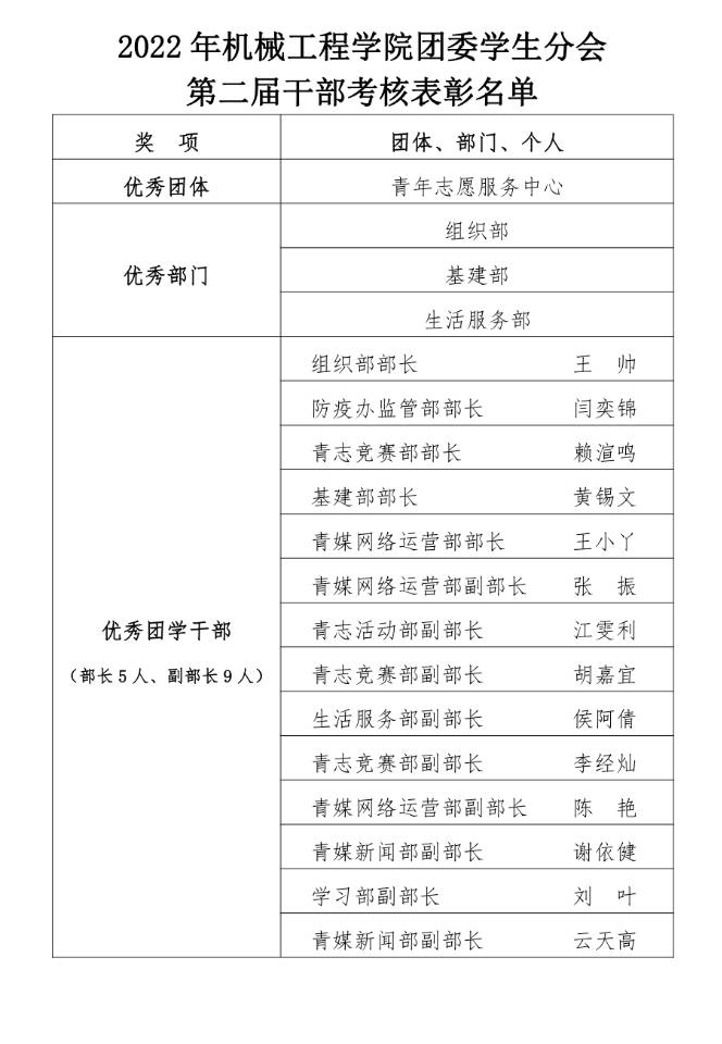为教育引导团学干部发扬创先争优、永久奋斗的精神品质,深化团学干部先进性评价激励机制。特评选优秀团体、部门、个人如下:
