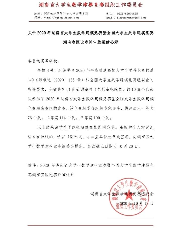 10月13日,2020年湖南省老员工数学建模竞赛暨全国老员工数学建模竞赛湖南赛区比赛结果揭晓,太阳集团tyc539macau组织的三支队伍从全省1046支队伍脱颖而出,全员获奖,其中一支队伍获得省一等奖,占全校省一等奖的50%,两支队伍获得省二等奖,占全校省二等奖的40%